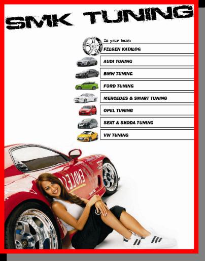SMK TUNING KATALOGE 2009 ab SOFORT direkt im Shop oder bei jeder Bestellung kostenlos dabei! Kataloge? Wir haben für Jeden den RICHTIGEN KATALOG, wählen Sie selbst: Alufelgen, Audi, BMW, Ford, Mercedes& Smart, Opel, Seat& Skoda und VW | |